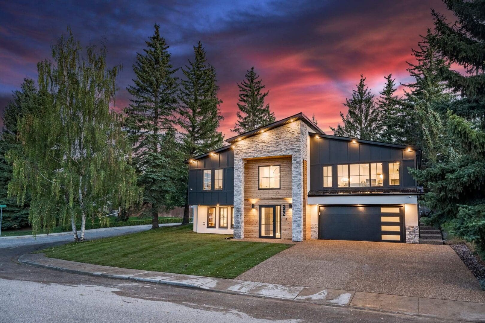 This remarkable property in Varsity Estates combines timeless elegance with luxury, situated on a spacious corner lot adorned with mature trees. Recently remodeled from the foundation up, it boasts a striking modern farmhouse style with stone and cedar accents, plus a rare triple attached garage. The impressive entry features vaulted ceilings and a custom glass railing, complemented by a spacious mudroom. The bright living area showcases a 75-inch, 3-sided electric fireplace and triple-pane windows for tranquility. The designer kitchen, an entertainer's dream, includes two-tone cabinetry, a 14-foot island, and premium JennAir appliances, seamlessly connecting to a light-filled dining area and deck for indoor/outdoor living